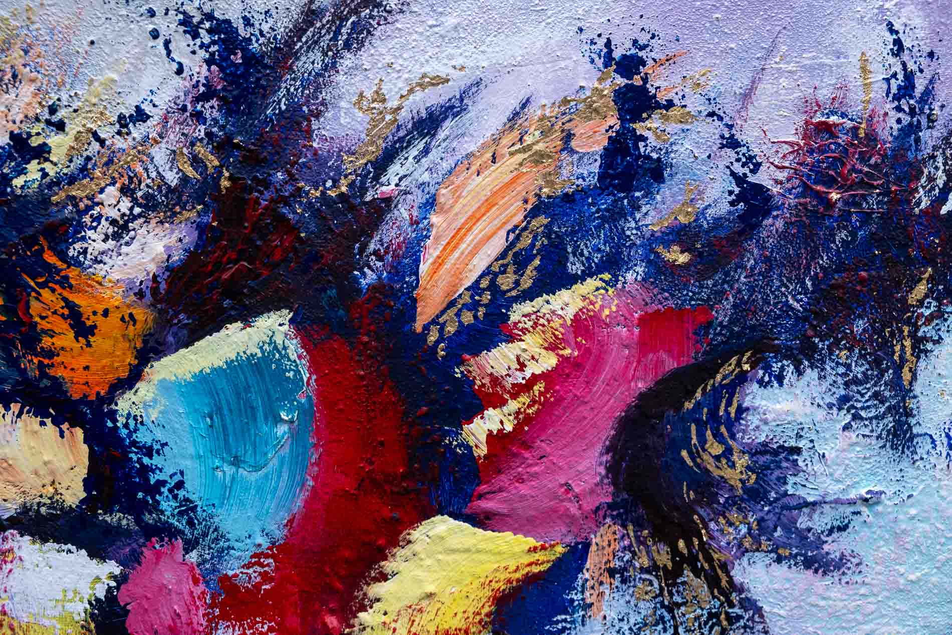 This vibrant mixed-media painting captures the exhilaration of kayaking through ocean surf, where turbulent waves meet the hidden world beneath. Bold sweeps of ultramarine, crimson, and turquoise dance across a textured surface built with sand, gravel, and clay, whilst touches of gold leaf catch the light like sun on water.
